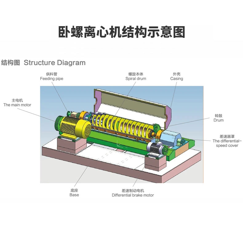 卧螺分离机是一种常用于固液分离的机械装置。其工作原理基于离心力和重力的作用,通过螺旋旋转运动来实现固液的分离。主要由螺旋体、料斗、螺旋推进机构、螺旋壳体、滤网、废液出口、清液出口等部分组成。工作时,固液混合物通过料斗进入装置,然后由螺旋推进机构推动入料螺旋旋转。当材料进入螺旋体时,受到离心力的作用,固体颗粒靠惯性离心作用向外壁移动,并顺着壁面向下滑动,同时清液则通过滤网孔隙流过,被收集到清液出口。